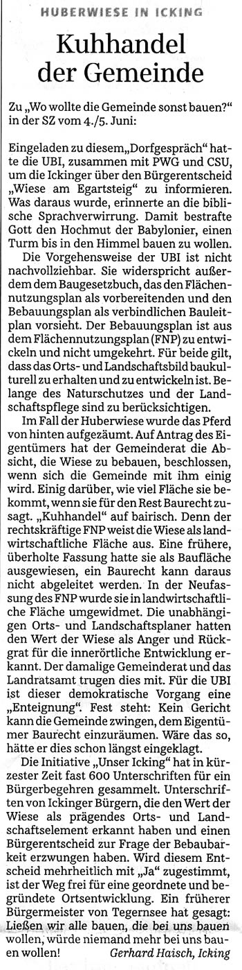 - 13.06.16, "Kuhhandel der Gemeinde", Leserbrief Süddeutsche Zeitung